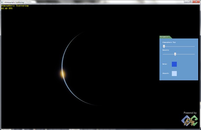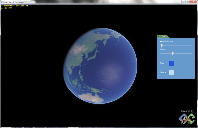 这个系统的参数有:大气层厚度、大气密度、散射的颜色分布、吸收的颜色分布,仅此而已,就这么简单。同样的系统,不同的参数就可以生成各种星球的大气散射结果。这个例子以后将会发展成一个大气散射编辑器。